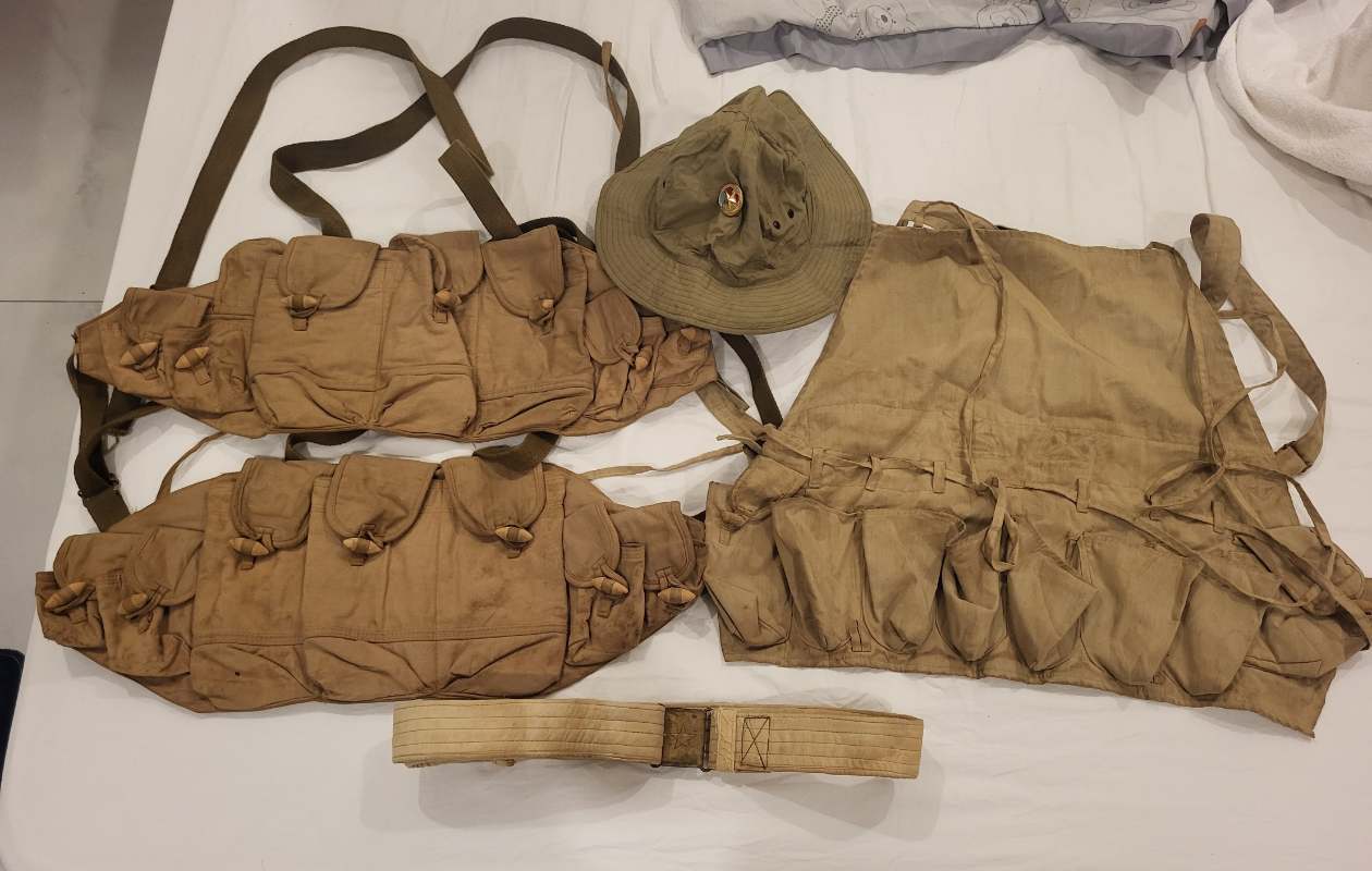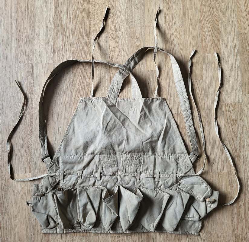 Hi all, I picked up this rig among others during a trip to Vietnam recently, which I think is for (stick)grenades. But I have never seen another one, either 'Live' or in pics. Is this type actually used pre-1973? It is completely unmarked and has 6 open pockets in the middle and a smaller pocket closed with a flap and wooden toggle on each side. The only metal parts are 2 sliders on the shoulder straps. For the actual color see the last pic.