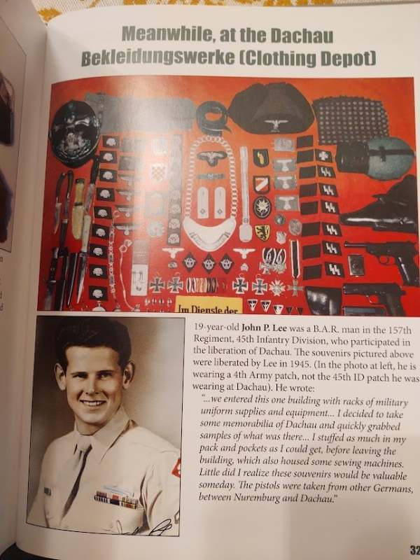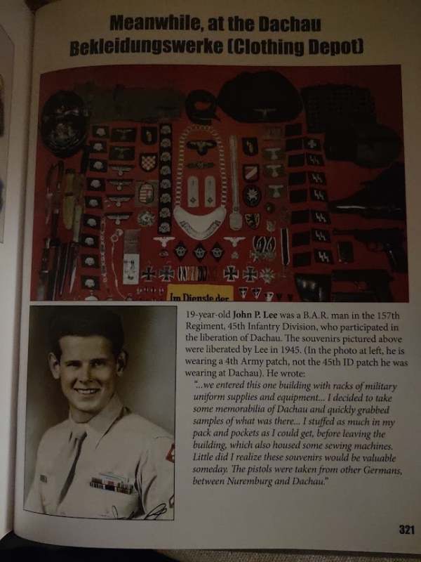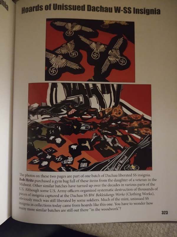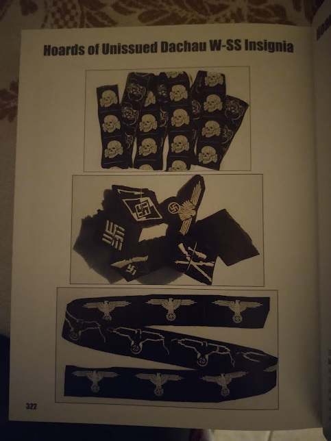 The clothing depot at Dachau was known as the Bekleidungswerke (Clothing Depot). The following images and testimonies are from Veterans who liberated Dachau and went into the Clothing depot and took insignia and other items. You will see the Italian sleeve shield in the first 2 images (Sorry for the glare) as well as other insignia that was found in uncut strips at the depot. These images are from the book: Insignia and Artifacts of the Waffen SS by the late Michael D. Beaver, (Text layout and captions by Mark A. Bando) This is a superb reference book that shows very detailed images of the SS insignia. This book is out of print and copies of this book when they are available are quite expensive.. Leigh