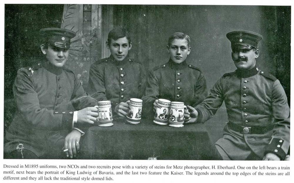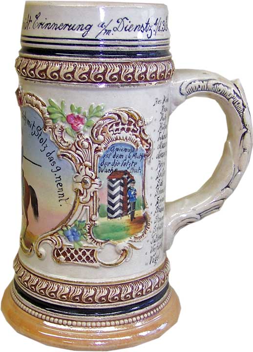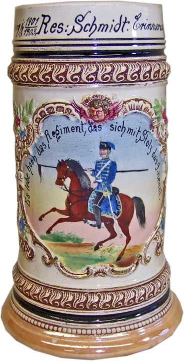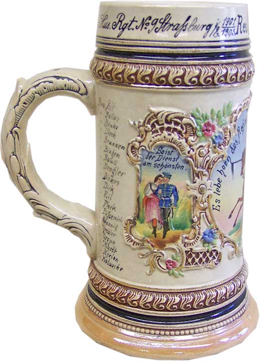 Kanemono Posted November 6, 2018 #1 Posted November 6, 2018 This stein belonged to a reservist who served in Husaren-Regiment Nr 9. This regiment was founded in 1815 and garrisoned at Straßburg. It was assigned to the XV. Armeekorps. It has many colorful scenes spread over its exterior. Its owner served in the regiment’s Eskadron Nr 3 from 1901 to 1913. His name was Schmidt. His fellow troops are listed on the side in two vertical lines. This is a pottery stein not porcelain. There is a hole in the handle which is to allow air to escape during firing. I do not believe this stein ever had a pewter lid. Here is a photograph with a group of reservists drinking from their pottery steins without lids.