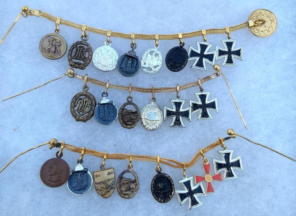 Brig Posted December 23, 2018 #1 Posted December 23, 2018 I've always been a fan of the miniature lapel chains, very commonly seen with WWI German awards, very rarely seen with WWII German awards, and also found in 1957 regulation awards. These were for wear on the civilian suit, and would be worn on the recipient's left side along the line of the lapel, hence the reverse order of the awards. The 16mm pendants used are the same types as the mini medals. Due to the ease of removing and placing these pendants, these are very easy to hump up, and you have to be careful when buying them. Because of this problem, they usually go for around the sum of the parts if not documented. I currently own three...the top one to an Afrika vet still has a war time or immediate post-war Afrika Campaign with the swastika. Bottom two chains both have pendants that display the tell-tale St&L 'O' mark on the rear.