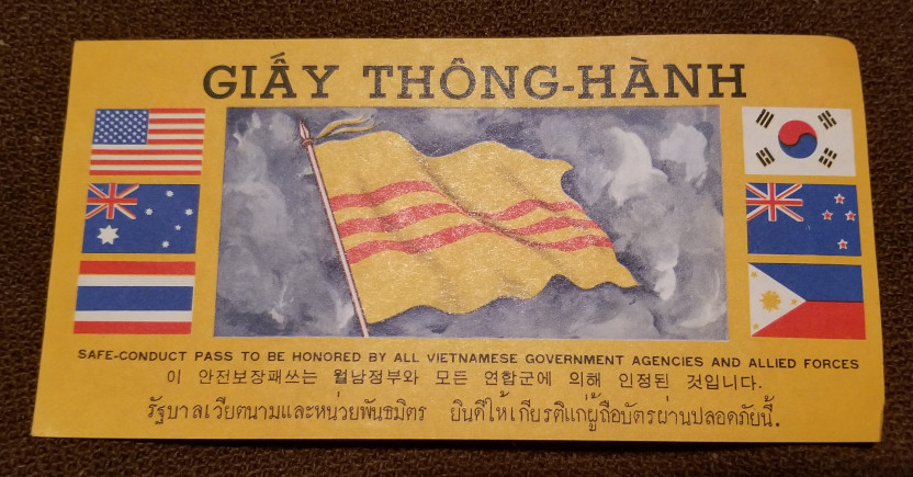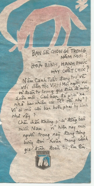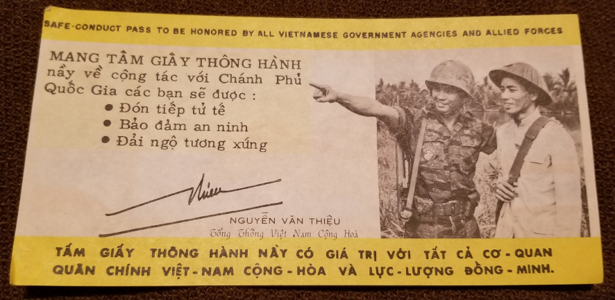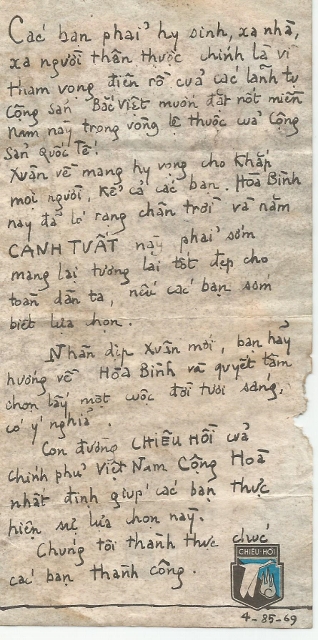Cap Camouflage Pattern I Posted May 24, 2019 Author #6 Posted May 24, 2019 Mike, I asked my Vietnamese friend what it said. This is his reply: (front) What will you choose for new year? Peace, happiness or death? The "year of the dog" is coming back to the Vietnamese race! Everybody are happily return to their families for new years eve. How many new years eve have you been leaving your family? For whom you are sacrificing for? I am sure it's not for your fellow Southern countrymens, because everybody down here are peacefully waiting for new years eve, as they are surrounded by their loving families. (back) You are sacrificing (yourselves) far from home, far from your families just for the crazy ambitions of Communist North Vietnam leaders who would like to at once put these Southern regions in the "circle of reliance" of International Communism! This New Years Eves brings hopes to everybody, you too. Peace has shown itself on the horizon, and this "Year of The Dog" will soon bring bright future for all of our countrymens, if you soon willing to choose (the right path). This New Years Eves, head to peace and determine yourself a bright, worthwhile future. The path to Chieu Hoi (Recall) by the Republic of Vietnam Government certainly will help you choose this path. We honestly wish you success. George