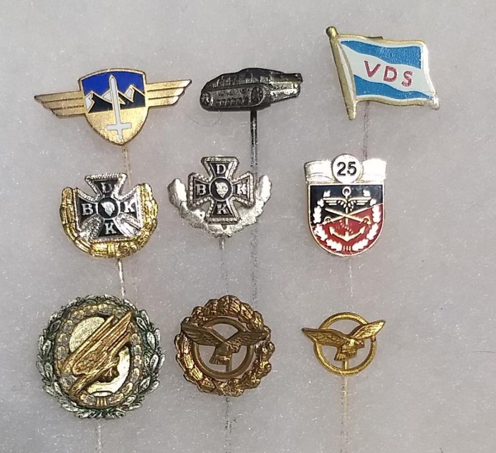 Brig Posted July 5, 2019 #1 Posted July 5, 2019 So over the years of collecting 57er miniatures, I have often acquired many a non-57er pin in a deal, most of which I assume to be veteran organization/reunion pins. Top row, I have no ideas at all... I know the BDKK pins are for the Association of German War Damaged...I have found the silver wreath to be for 25 years membership, and the gold for 40 years The 25 pin with the anchor I have found is for the Bundeswehrverband, a veteran organization. Is this for 25 years of membership? The FJ one I assume is a reunion group or event...does anyone know more The two with Luftwaffe eagles are for the Deutscher Luftwaffenring veteran organization, but again not sure what the differences mean. I assume the one with just a ring is membership, but what about the one with the wreath?