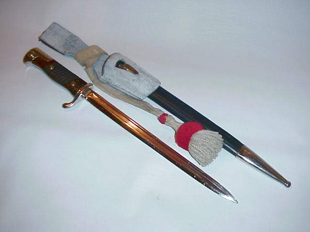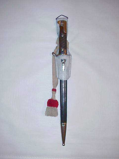SARGE Posted October 24, 2019 #1 Posted October 24, 2019 Gents, I want to show a private purchase (Extrawaffen) Imperial German Model 98 style dress bayonet. This bayonet is styled as the S98 (Seitengewehr M/98) in German literature. This Extra-Seitengewehr has no bayonet lug attachment nor does it have a muzzle ring so it will not affix to a rifle. These bayonets were used solely for walking out dress or for wear off duty. They are quite scarce on the collector market. This bayonet has a long flat nickel plated blade that is fully etched on both sides. Unlike the issue bayonet that has a pipe back polished steel blade with a long fuller this blade is wide and flat to accommodate the extra cost etching. The bayonet has a standard black leather scabbard with nickeled steel fittings to match the nickel plated hilt. It also has an original black leather frog and a correct Enlisted bayonet knot (Troddel) to indicate the unit.