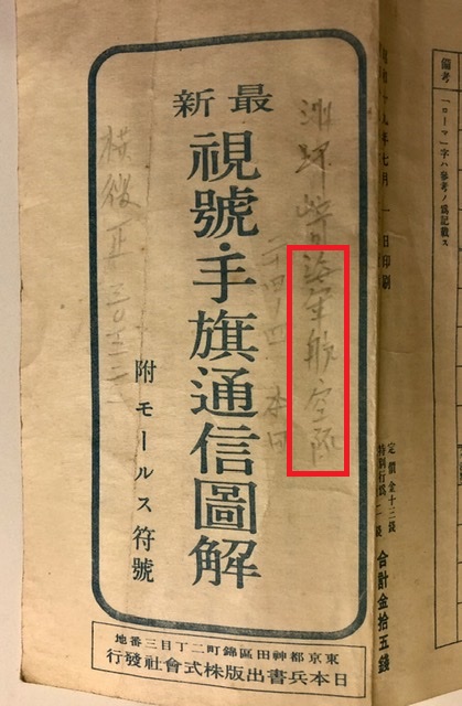 Eric Queen Posted February 19, 2020 #7 Posted February 19, 2020 The front of the book simply says Takachiho Shoboukan (高千穗書房刊) = Takachiho (family name) Bookstore The book is named inside the cover to Nakagami (family name) Minoru (given name) 中神実 The paper insert is a chart for visual and hand flag communications (including Morse Code) 視号手旗通信圖解 shigou tebata tsuushin zukai. What I find most interesting is what is written in pencil and highlighted in red below. 海軍航空隊 Kaigun Koukuutai = Naval Aviation Corps