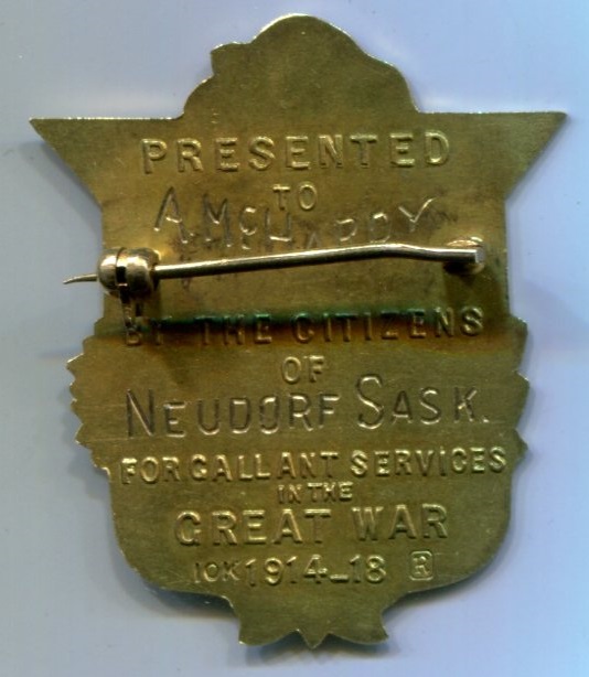 Fred Borgmann Posted April 7, 2020 #1 Posted April 7, 2020 Almost every time I run into one of these medals it is unlisted and I have a fairly large listing of the known Canadian local issue medals. This one is from Neudorf, Sask. and is named to A. McHardy. The medal is a 10k gold pin back. The design type is the most common of a soldier with rifle and flag background mounted on a beaver top shield. This probably indicates a small town that could not afford any medals not of a stock design. Also Canadian gold medals do not usually indicate a posthumous award as in the United States issues.