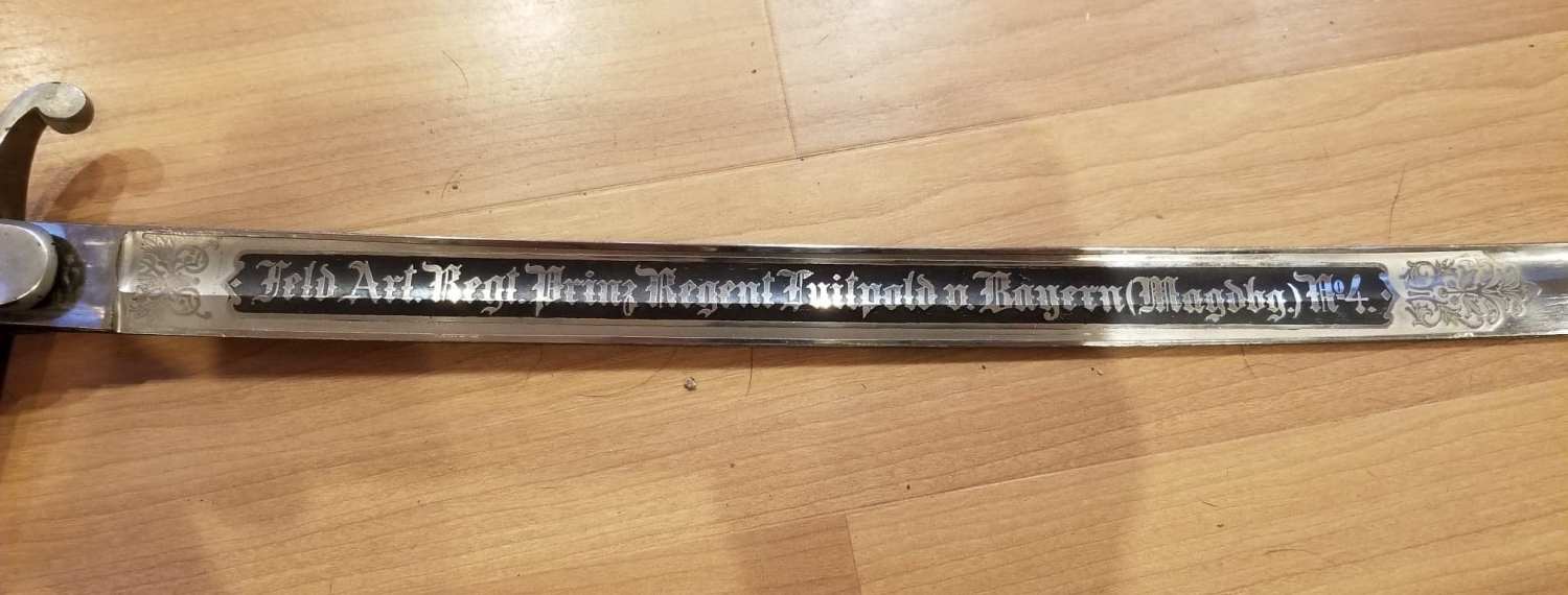 SARGE Posted May 9, 2020 #4 Posted May 9, 2020 Yes, a very nice private purchase enlisted/NCO Artillery Trooper's sword. Your sword is etched to the 4th Field Artillery Regiment of Prince Regent Luitpold of Bavaria (Magdeburg). These were privately purchased by soldiers as a better than issue sword that could be worn off duty.