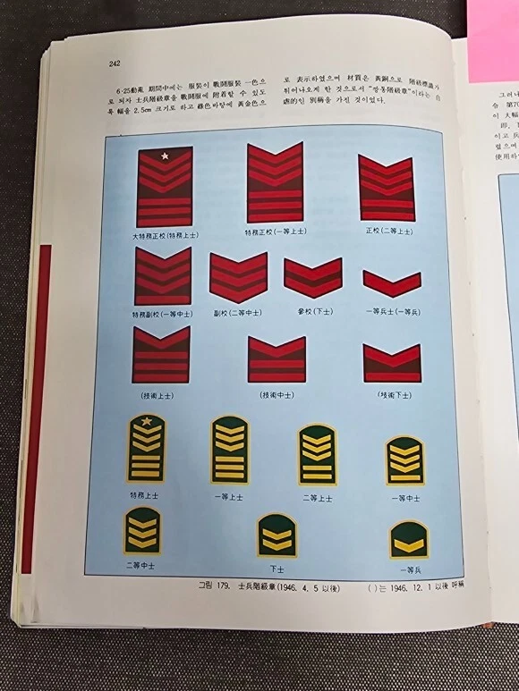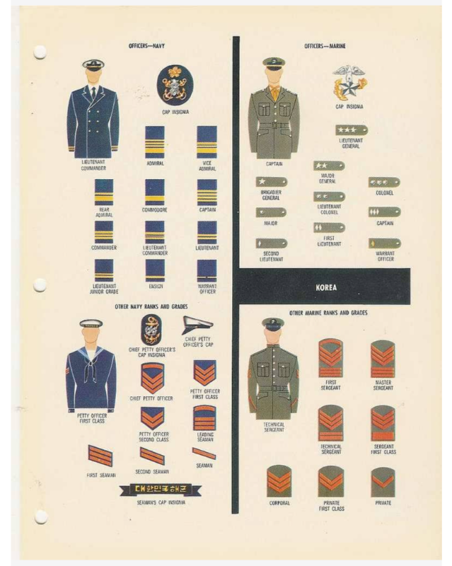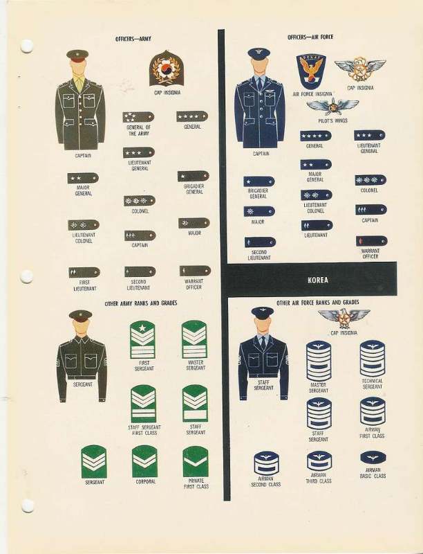 S.ChrisKelly Posted August 15 #4 Posted August 15 Source: https://www.ebay.com/itm/145648729568 "KOREA ARMY SOLDIER'S METAL RANK INSIGNIA OF THE 50'S(KOREAN WAR)" Image file copied from Military Uniforms - DA Pam 355-120 - 1959 to 1962 - Part 3 at https://archive.org: MILITARY UNIFORMS Insignia Organization 1959-1962 US Armed Forces Information DA Pam 355-120 030 KOREA ARMY AIR FORCE Archive.org No known copyright.jpg DOD Pam 1-14 DA Pam 355-120 NAVPERS 92622 AFP 34-11-2B NAVMC 2505 MILITARY UNIFORMS A Manual of United States and Foreign Armed Forces Uniforms, Insignia, and Organization The manual of Military Uniforms is being published in installments as material on various foreign countries becomes available. This looseleaf booklet permits alphabetical arrangement of countries or any other arrangement that is desired. All information concerning the uniforms, insignia, and description of the Armed Forces of each country has been furnished by the government of that country. The first installment, published early in 1960, had pages on Canada, Denmark, France, Federal Republic of Germany, Greece, Italy, Luxem-bourg, Netherlands, and the United Kingdom. The second section included Brazil, Haiti, Iran, Israel, Japan, Republic of Korea, Norway, Philippines, and Pakistan. This, the third section, consists of Australia, Portugal, Spain, Turkey, United States, and Viet-Nam. U.S. women's military uniforms will be represented in a later installment and can then be inserted with the other U.S. uniforms. ARMED FORCES INFORMATION AND EDUCATION DEPARTMENT OF DEFENSE