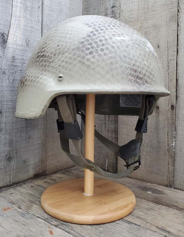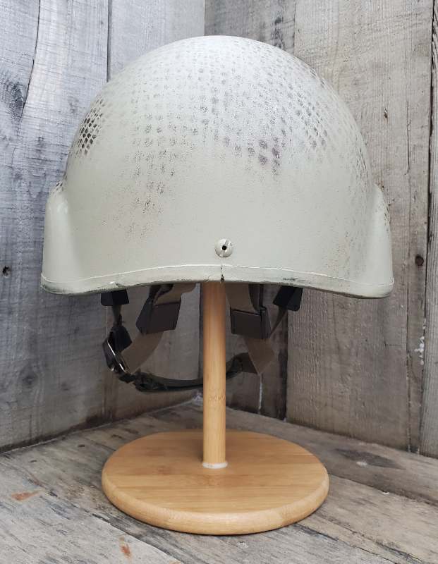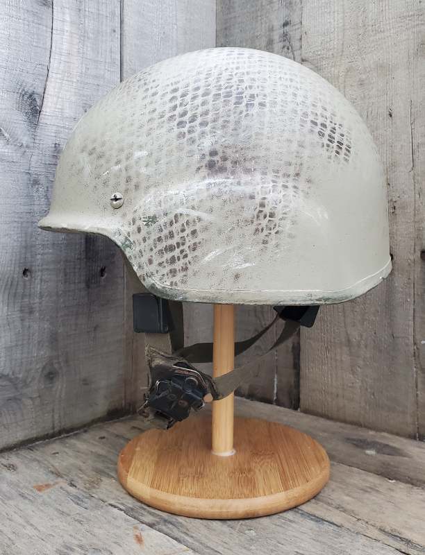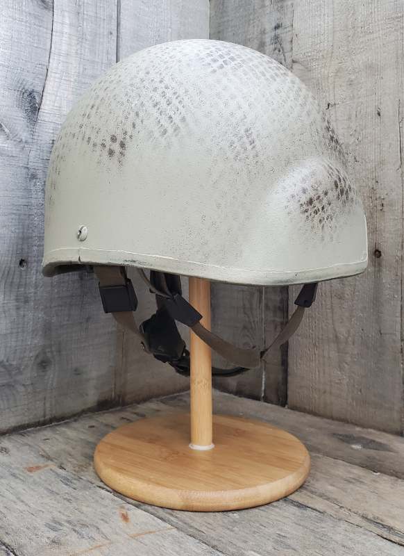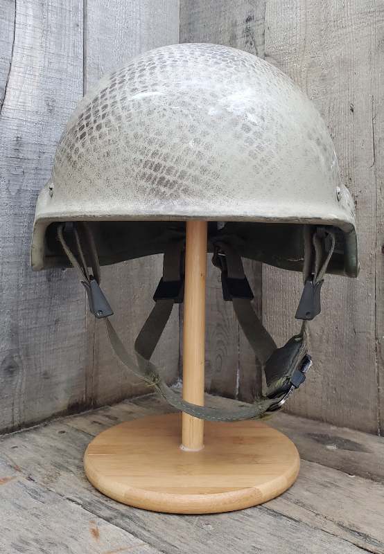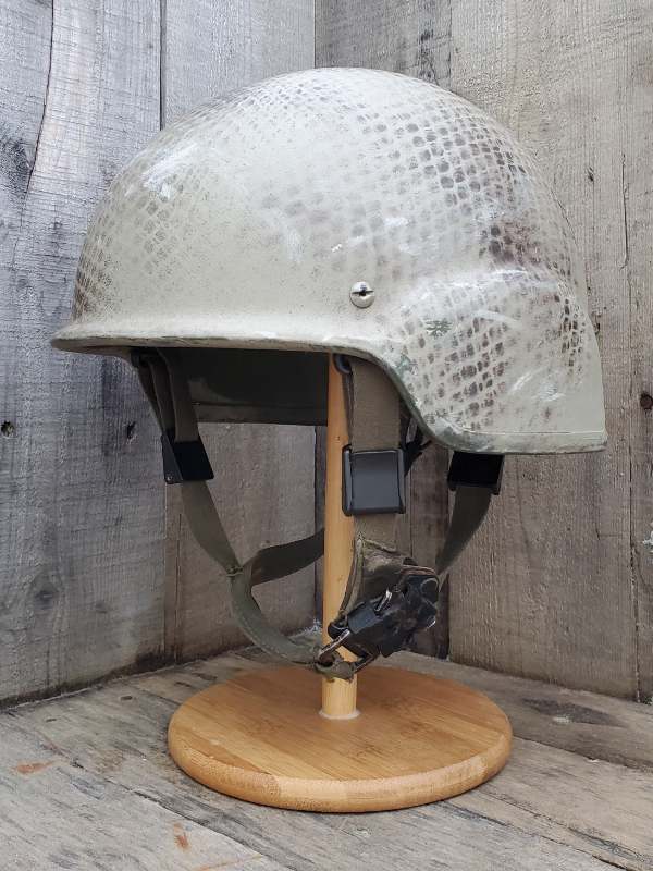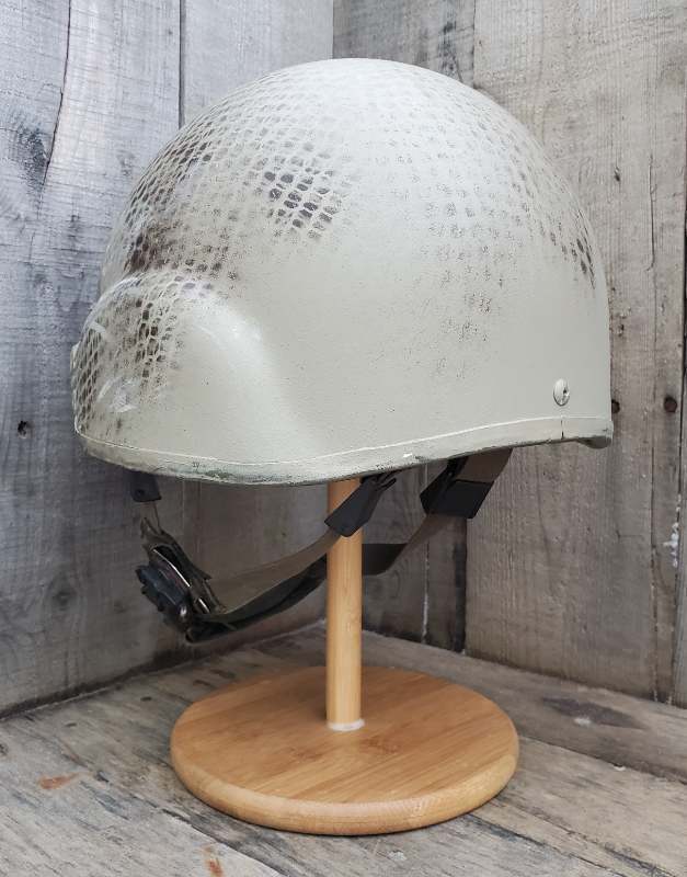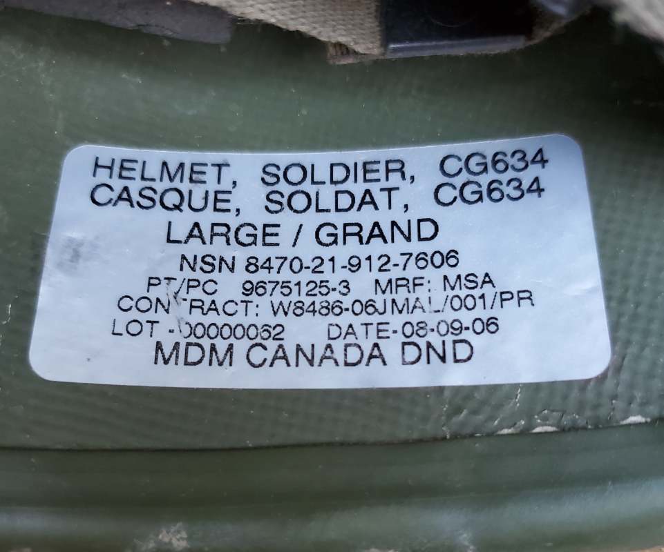 Mark K Posted November 18, 2021 #1 Posted November 18, 2021 One I needed to fill a gap in my collection the Canadian second generation CG634 composite helmet these were produced by Mine Safety Appliance ( MSA ) in the United States with either Spectra which is a patented product of the Honeywell corporation and or Aramid (Kevlar) was used in later production models they have been ballistic tested at a minimum of v50 of 634 m/s.. It mates a modified French design, based on the PASGT, but was adapted for compatibility with Canadian equipment ( headset, respirator, vision devices, and armoured vest ). The suspension system combines a thick foam trauma liner with a rubber and nylon webbing suspension based on the French Mle-78 ( Gallet TC-3 )... The CG-634 has a 3-point chinstrap retention system with flip down adjustable buckles for an enhanced fit, there are a few small details one can use when visually comparing the 1'st and 2'nd generation examples to tell them apart one of which is the protective wrap that surrounds the rim of the helmet body which will be found as black rubber on the 1'st generation CG-634, The protective wrap on the 2'nd generation CG-634 as produced by MSA was moulded in the same green colour as the helmet body and was manufactured from plastic as opposed to rubber as found on the 1'st gen helmets ... One other easy way to tell the difference is that the female receiving end of the duel tab fold in buckle will be found found stamped with the ( MSA ) company logo, this particular example is in well worn condition and is dated 08/09/06 it has been field painted in a tan colour with a brownish camouflage over spray... I am of the opinion that either a camouflage net and or laundry bag was used during the application process there are period images to support that this type of camo was used early on in the Afghanistan war by Canadians, Americans and the Netherlands it has been loosely referred to as snake skin.. Regards Mark