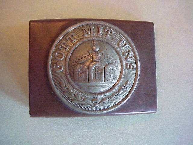 SARGE Posted November 21, 2021 #1 Posted November 21, 2021 Gents, I picked up a nice unmolested German Colonial (Schutztruppen) enlisted belt buckle over the weekend that I thought I would show. Similar to the more common Prussian belt buckle with the crown for the King of Prussia (Wilhelm II), this one has the Imperial Crown indicating Wilhelm as the Emperor of the German Empire. This Imperial Crown insignia was worn by soldiers and sailors of the Empire serving in branches, such as the Navy, instead of German State forces that made up the bulk of the Army. At any rate, this uncleaned brass box buckle has a white metal roundel that contains the "Gott Mit Uns" declaration around the edge and the more angular German Crown of the Empire. The roundel is lead soldered onto the brass buckle as is common with this style of buckle. These buckles were worn on brown leather belts by the various Colonial Troops known as Schutztruppen and Polizei Truppe.