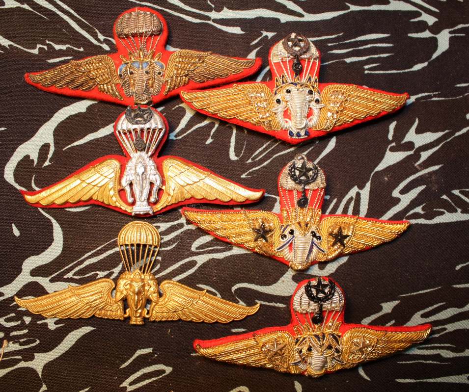 triplecanopy Posted September 24, 2022 #1 Posted September 24, 2022 Shown here are just a few examples of Thai Army and Thai Special Forces Parachute wings. You will notice numerous differences; some slight and some large in both shape, design and material. Even with differences, all of these wings have the three headed elephant or ERAWAN featured in the center. The upper left badge is the oldest in this group. These wings are found in basic, senior and master grades similar to US parachute wings. My favorite is the lower left brass wings with extra nice detail. The stars on the wings of the wings on the lower right wings indicate Military Free Fall or HALO qualification. These wings are also found in cloth, both color and subdued.