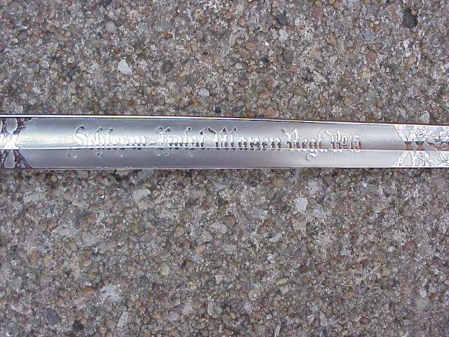 SARGE Posted February 19, 2023 #1 Posted February 19, 2023 Gents, This is a private purchase Senior NCO (Unteroffizier mit Portepee) M89 Prussian Cavalry Saber. This particular sword is identified to the "Schlesw.=Holst. Ulanen Regt. No.15" on the obverse blade etching. The reverse blade etching shows Uhlan Cavalrymen in a combat scenario. The sword was made by Alexander Coppel as their Nr.1605 with a folding guard. The hilt has a black celluloid grip and the fittings are nickeled steel. The folding basket guard has a large Prussian eagle on the obverse and a narrow folding counter-guard on the reverse. The Prussian Officer Portepee is the authorized knot for an Unteroffizier mit Portepee. The straight scabbard is black painted steel with one fixed suspension ring indicating EM and NCOs. The double etched blade is straight and has one wide fuller. It seems the Schleswig-Holstein Ulanen Regiment No.15 was authorized on 30 October 1866 and was set up 2 November 1867. It served during the occupation of France after the 1870/71 War and was garrisoned in Strasbourg. In 1896 the regiment moved to Saarburg in Lorraine. This sword was manufactured after 1910 as evidenced by the single suspension ring. I have not explored the wartime service of the regiment during WWI.