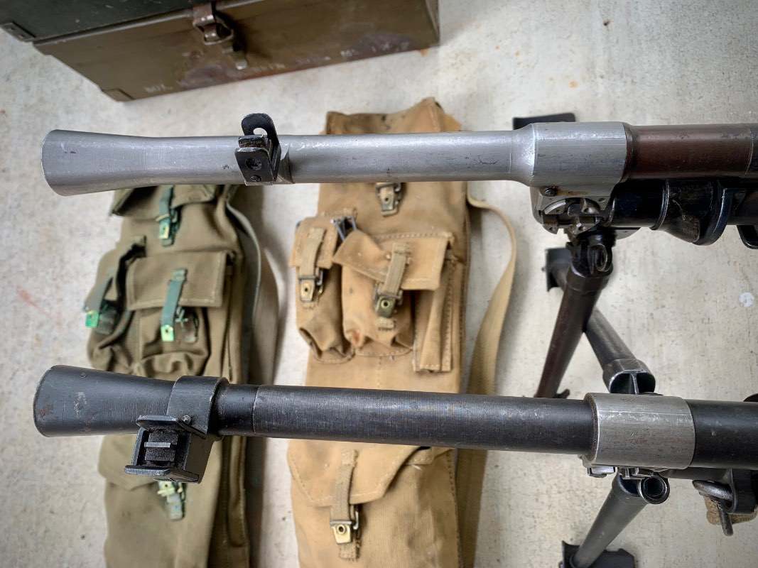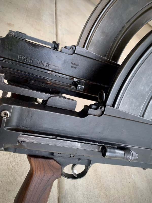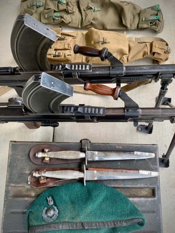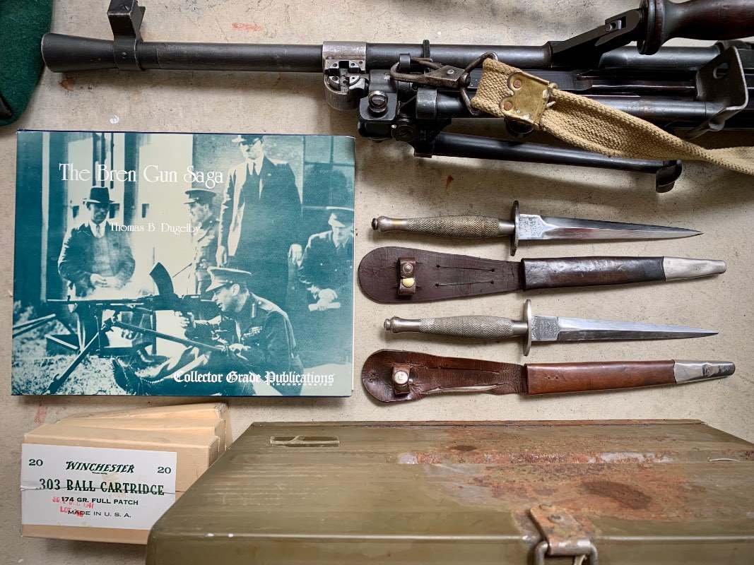 dcollector Posted May 10, 2023 #1 Posted May 10, 2023 So these two reconditioned old restorations are home after their protracted stay in transfer-prison. Sharing some images for those that are interested. I qualified on this monstrosity when I was a 14 year old cadet, and have had a love/hate with it ever since. I had the mags and spare parts in my closet for decades, finally decided to have them built into CA DOJ, BATF, 922R compliant Semi-auto rifles whilst retaining as much WW2 as is possible. 1. MKI Bren Gun 1943 - Drum rear-sight - (barrel fore-end in the white. Hump-back stock.) With canvas spare barrel bag, and cleaning kit. With Mag carrier containing 12 x 30 round magazines (still in original grease paper, still smells like rotten British food.) This is wearing reproduction wood I sourced and a reproduction sustained fire butt-plate. 2. MKII Bren Gun 1942 - standard elevation rear-sight - canvas sling. With Canvas spare barrel bag and cleaning kit. With Mag carrier containing 12 x 30 round magazines (used and abused.) 3. Two of my favorite original 1941 Fairbairn Sykes First Pattern daggers. Great blade shape, beautiful condition, unique color "issue" leather scabbards. *Crazy thing is these knives are worth more at auction than the Bren guns! 4. One Royal Marines Commando Officer's Beret (Post war, sorry) 5. 60 rounds of Winchester 1942 dated .303 174 grain (full patch) ball cartridges - made in the USA. These will run the Bren like a scolded mule, the cordite clean up afterward being similar to said mule incident, too. 6. The Bren Gun Saga revised 1999 edition by T. B. Dugelby. Collectors Grade Publications. Hard cover. A great resource if you're interested in this old iron. Though be warned it's kinda an expensive book to purchase. *Look at the Bren receiver sections and you can see where they were welded together (quite a rough job unfortunately, a bit "chewing-gum" weld) from destroyed parts; what you cannot see is the BATF approved semi-automatic conversion within the receiver and the 922r US made parts. I'm a little disappointed by the cosmetics but all the welds seem solid enough. The price point was in my grasp so there's that. Both barrels have had the flash-hider cone filled - making it no longer a flash-hider. CA compliant Kydex fins removed for photographs.