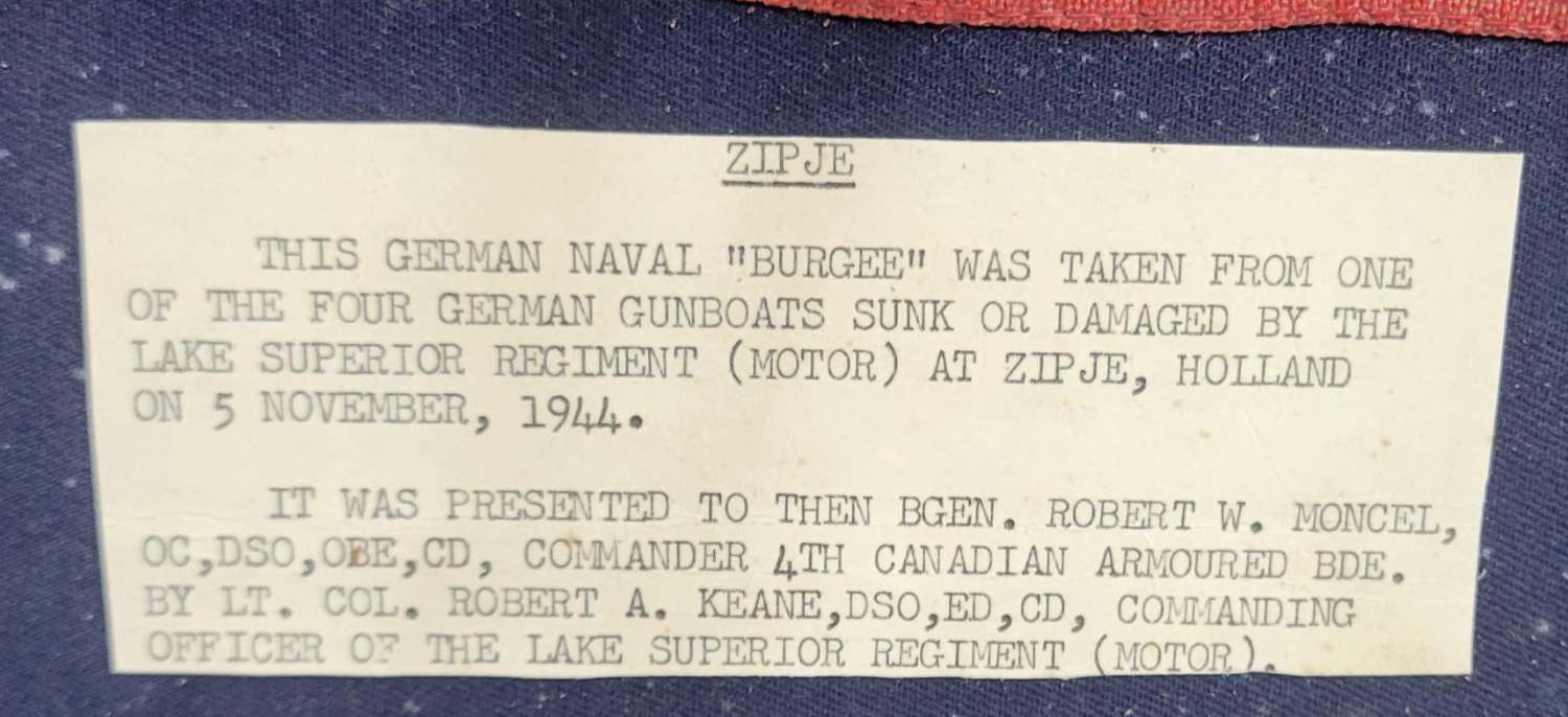Robster Posted January 31, 2025 #1 Posted January 31, 2025 Hello Found this at an estate sale in B.C. . Appears to be a German Naval War Merit Pennant in rough shape and glued to a cloth panel. It has a label that says it was captured by the 4th Canadian Armoured Brigade at Zijpe Holland during the Scheldt Campaign 5th November 1944 and presented to General Moncel. During the battle the Lake Superior Regiment (motor) and the British Columbia Regiment (28th CAR) sunk or damaged 4 German naval vessels (3 armed converted landing ships and a Corvette-like ship). Later men rowed over and collected German flags to prove what had happened. Apparently, this Battle was the first time land based tanks had sunk warships. I understand that these War Merit pennants were awarded for sinking enemy ships. It is very faded and a good part of it is missing. I found a few articles describing the events, but I am wondering if there is more information out there about this item or the men involved. I am including a picture of 3 of the vessels involved. Any help would be greatly appreciated. Best Regards Rob