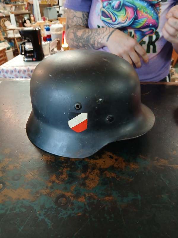 easterneagle87 Posted October 8 #1 Posted October 8 I will not claim this is a "transitional" helmet as the decal has been viewed as a repo. Probably repainted black for use in roll play, theatrical etc, but it's been a long time due to the chipping I see. There are remnants of the leather liner stuck in the liner ring. I can't find any makers stamps on the inner skirts. It's just a solid lid. Enjoy.