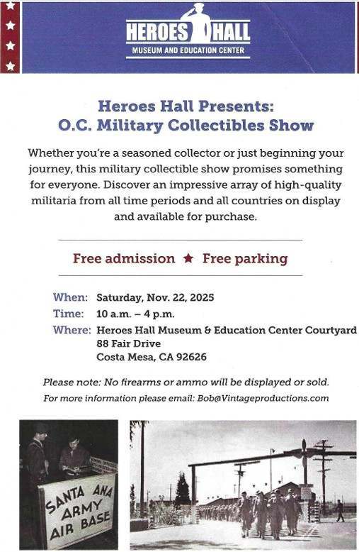vintageproductions Posted October 17 #1 Posted October 17 New Southern California Militaria Show. Heroes Hall Presents: OC Military Collectibles Show. Heroes Hall Museum 88 Fair Dr, Costa Mesa, CA Saturday Nov 22, 2025 10am-4pm Please note: No firearms or ammo. Free Admission and Free parking This should be a fun, easy show held at the former location of the Santa Ana Army Air Base.