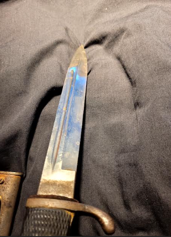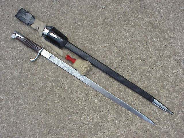 SARGE Posted February 25 #11 Posted February 25 You are welcome. Extraseitengewehr were often used as shooting prizes and sometimes had etched blades. I do need to correct what I said when I pointed out the grips. They are not plastic but carved wood in the style of the later plastic grips. Here is another example of Imperial time period extra sidearms in the form of a S98 bayonet. Notice the long wide blade that is etched on both sides. This one will not fit on a rifle either. It does have a false button in the pommel and a piece of red felt in the pommel slot.