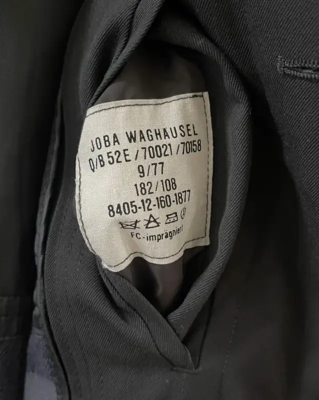 yellowhammer history Posted March 24 #1 Posted March 24 While at a trift store I noticed a coat that looked military, after a minute of inspecting it I finally found the tag. I believe this is west german? I don't have a photo of the whole coat but I got two photos online that look to be the same. I did take a picture of the tag for future reference. I was wondering if anyone could tell me when it's from?